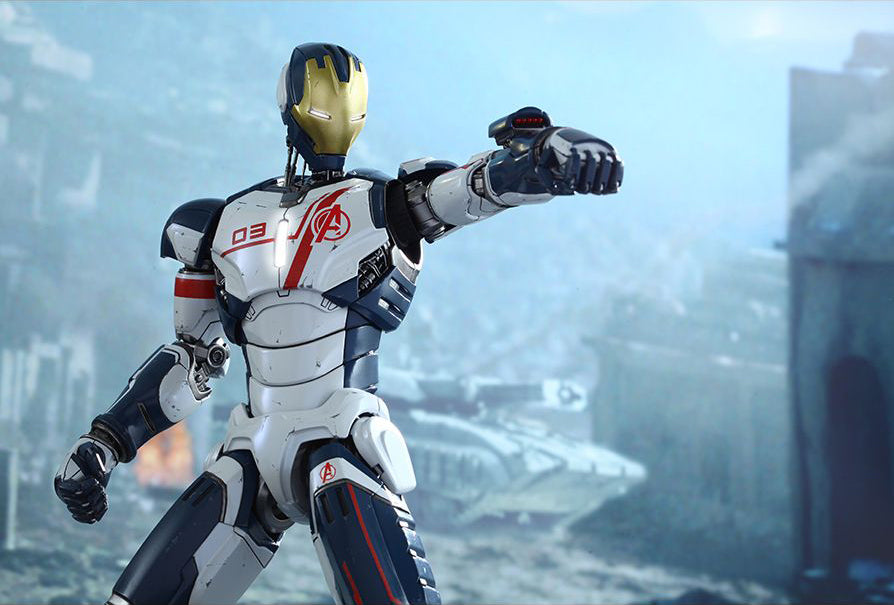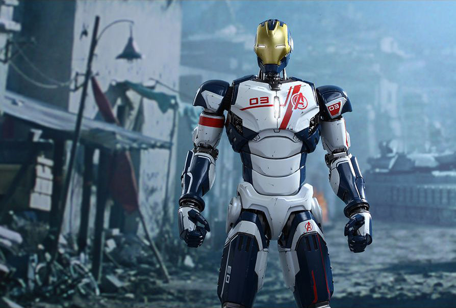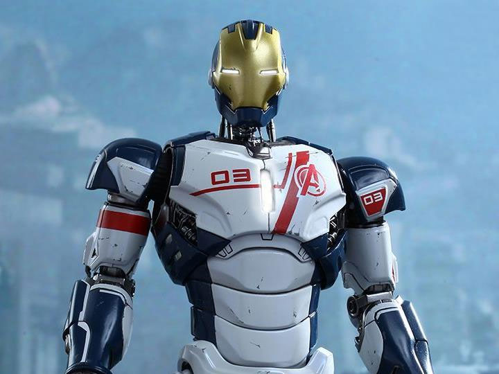 - Metallic red, white and navy blue colored painting on armor with weathered effects and Avengers decals