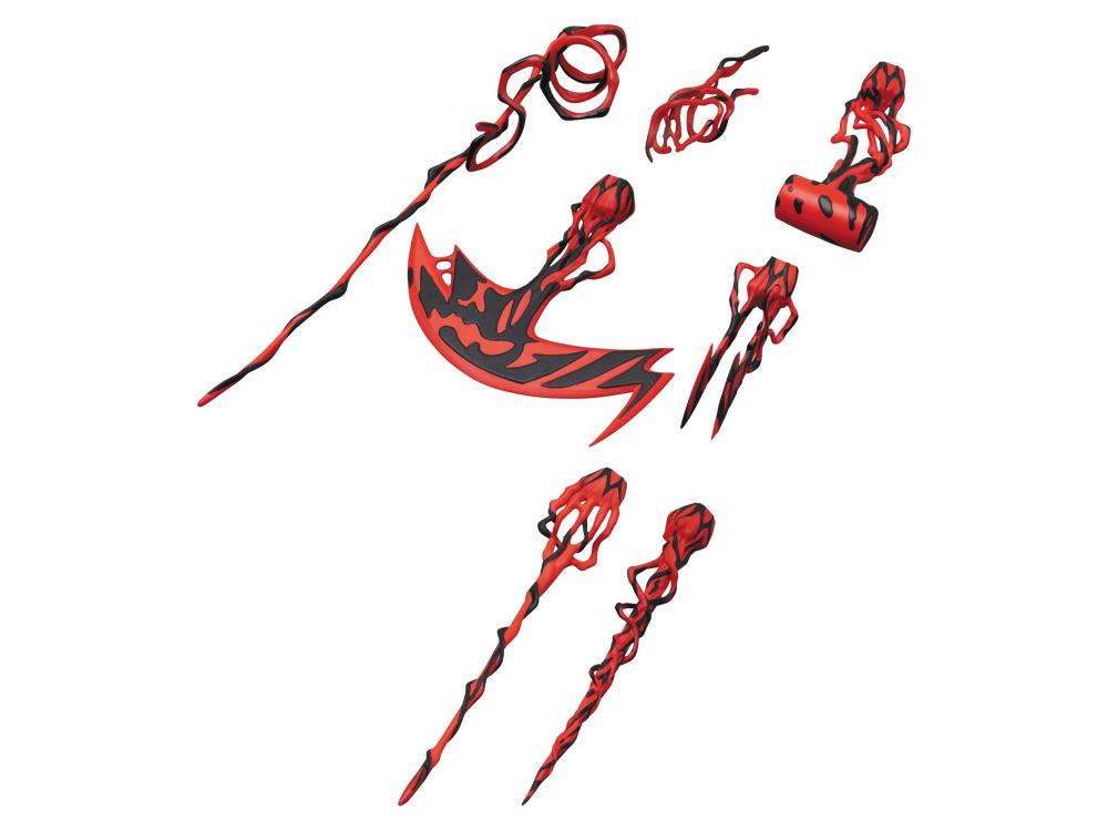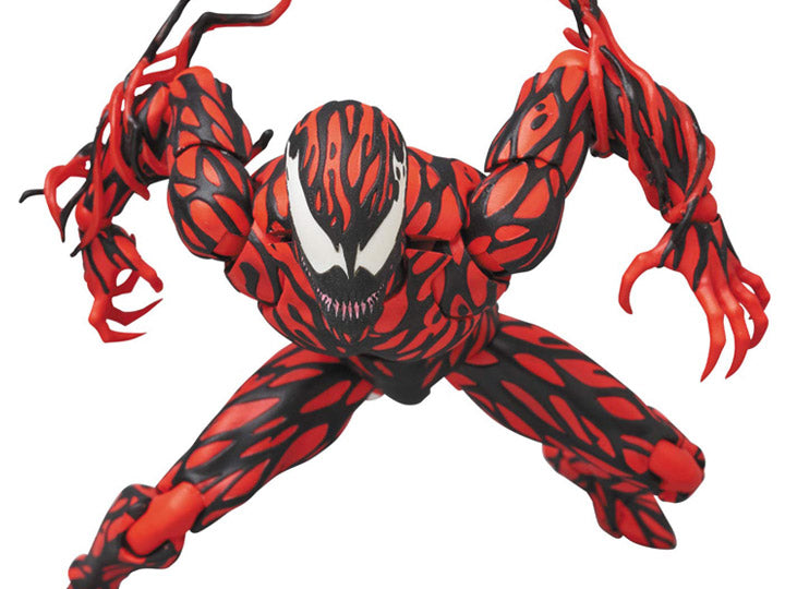 The Mafex Carnage figure stands over 6 inches tall and features a high level of articulation. Carnage includes several swappable tendril effects and a Cletus Kasady portrait.