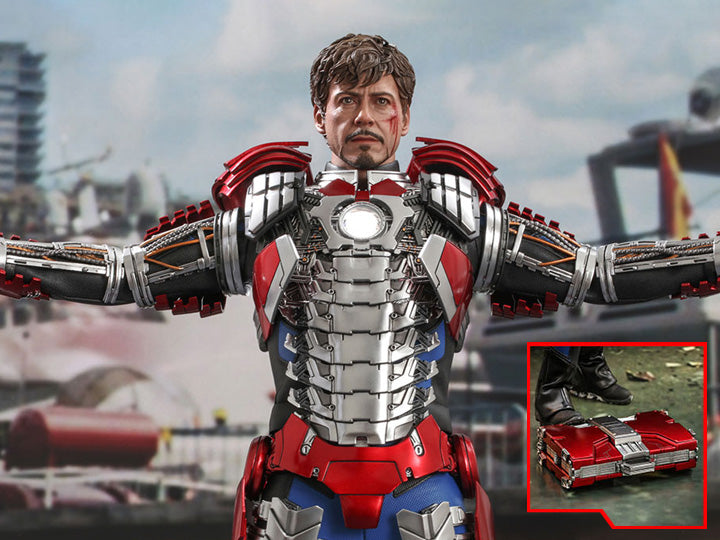 The movie-accurate figure is finely crafted based on Robert Downey Jr. as Tony Stark/Iron Man in the movie, features a newly developed Tony Stark head sculpt with specially applied battle-damaged effects; a gorgeously detailed racing suit; LED light-up function design on arc reactor, and forearms; attachable Iron Man Mark V armor parts in defined proportion including helmet, chest and shoulders, upper back, thigh and calf armors, hands with articulated fingers; skillfully painted in red and silver coloring with an astonishing metallic appearance; several pieces of interchangeable armors for different assembling looks; and a figure base.