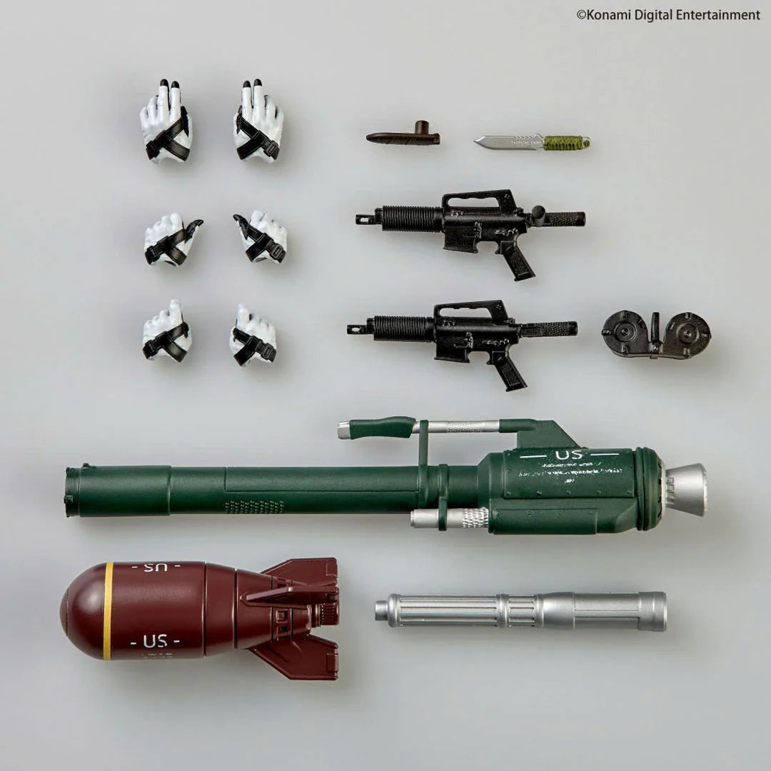 The Soviet-made sneaking suit features metallic paint to recreate the texture from the game. The unique full-body articulation allows for realistic posing, including close-quarters combat (CQC) and realistic stances when wielding firearms. The stern-faced character even features movable eyeballs! Her signature assault rifle, modified into a pistol with a shortened barrel, can be fitted with an unlimited magazine. A miniature nuclear warhead, launcher, and propulsion rocket motor for firing are also included.