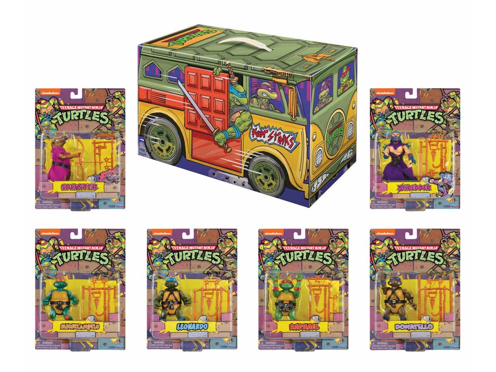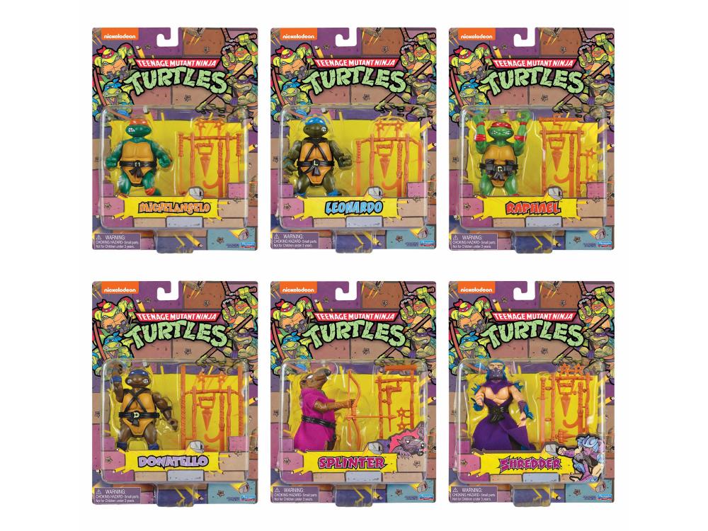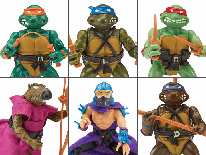 Cowabunga, dude! The Teenage Mutant Ninja Turtles are back with Playmates' Retro Rotocast Figure Set. The figures in this 6-piece set feature original bodies with authentic decoration from the '80s action figures and oversized roto heads. The Turtles have their individual Bandana colors and include the letters designated on their belts and the weapons rack. The packaging is inspired by the original package design from the 80's, complete with the original brick work and original Turtles logo. Figures include Leonardo, Dontallo, Michelangelo, Raphael, Shredder, and Splinter. This decorated soft bundle 6-pack placed in 4 color inner with protective sleeve for SDCC.